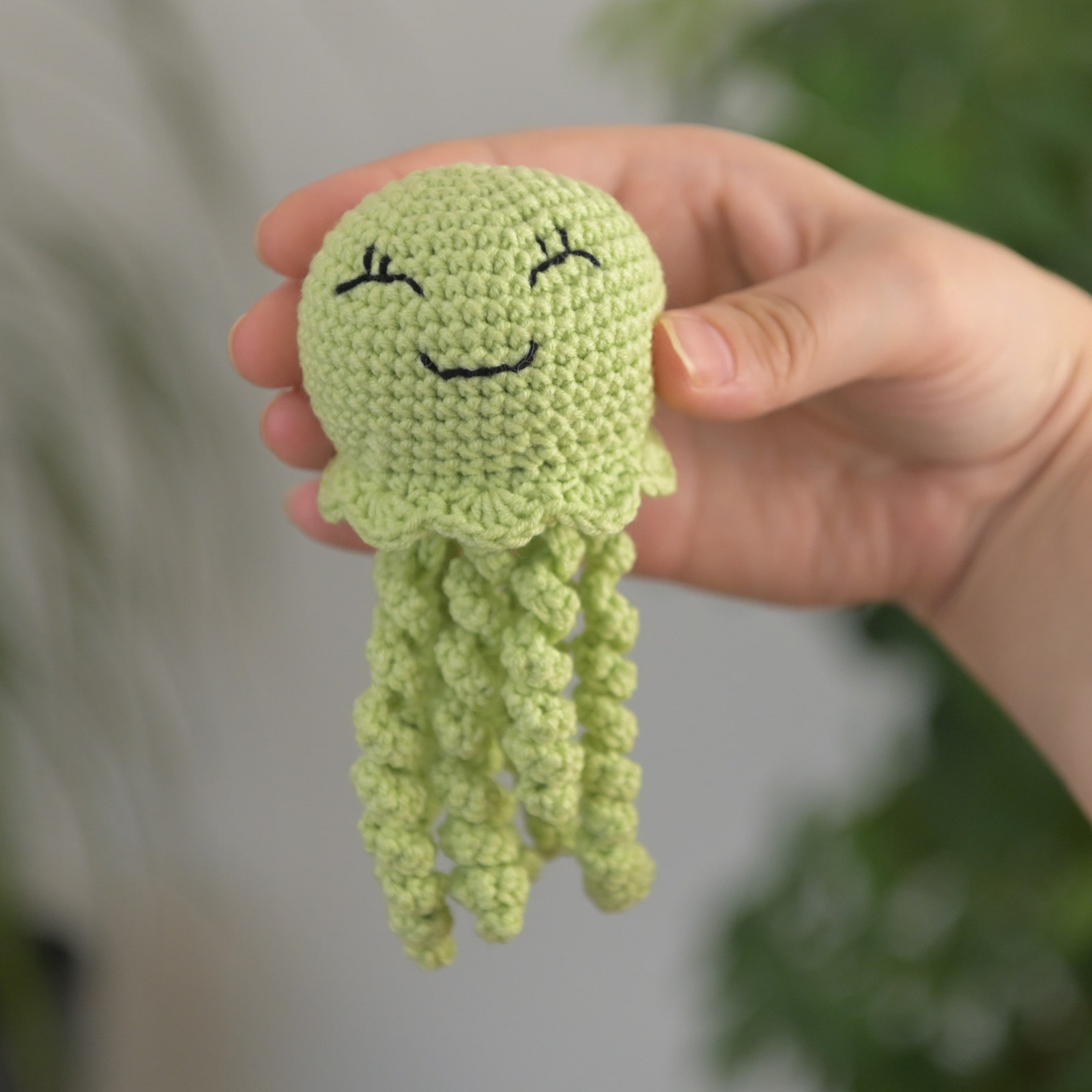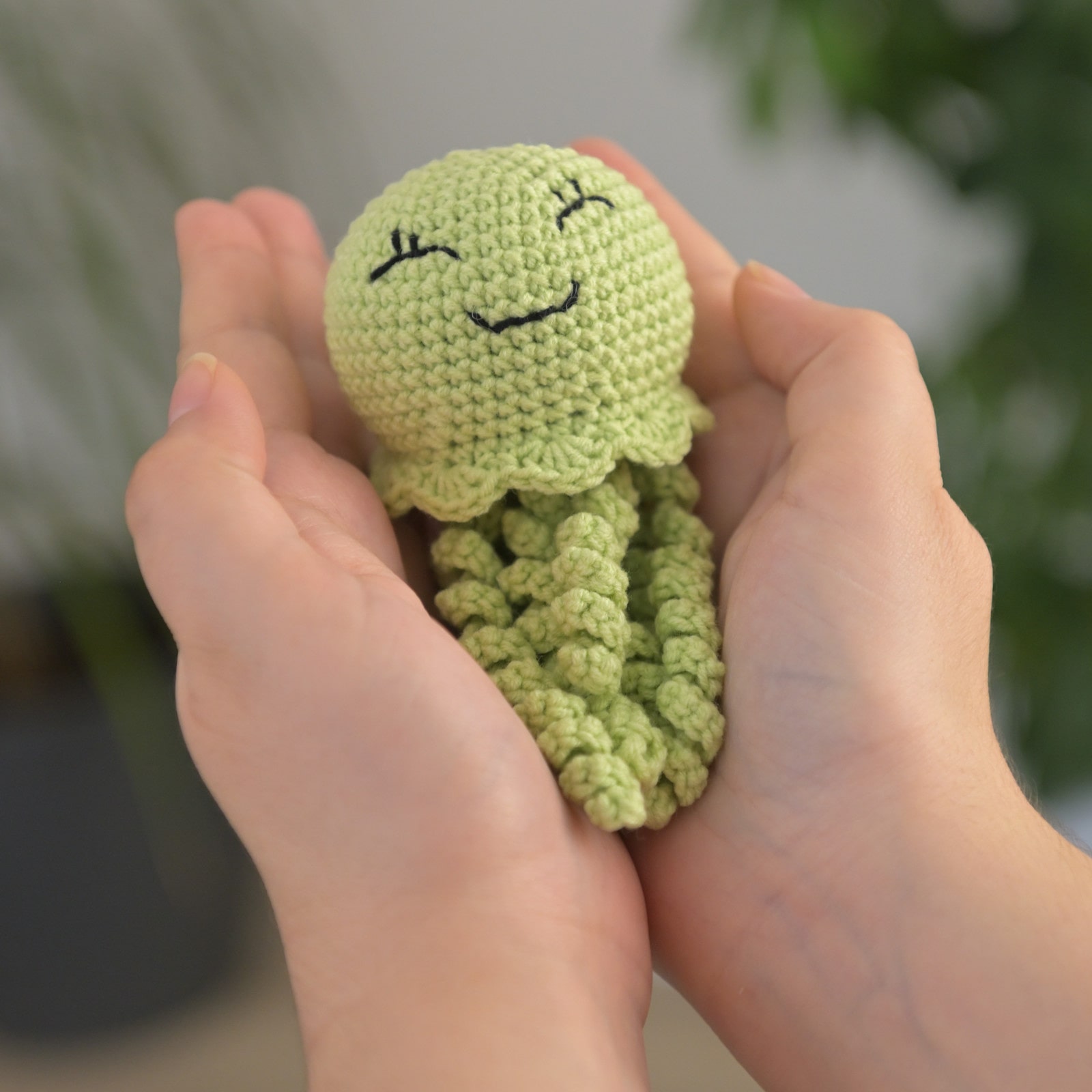 Její mírumilovný a vyšívaný úsměv s přivřenýma očima šíří klid a pohodu. Skvěle padne do dlaně a je ideální na mačkání a hlazení. Každá chobotnička je jedinečný ručně háčkovaný kousek. To zaručuje detailní zpracování a lásku vloženou do každého stehu. Hledáte-li malý, ale srdci milý dárek, tato Chobotnička je perfektní volbou. Je ideální pro milovníky mořských motivů, ruční práce a pro každého, kdo potřebuje trochu slunce a barvy.