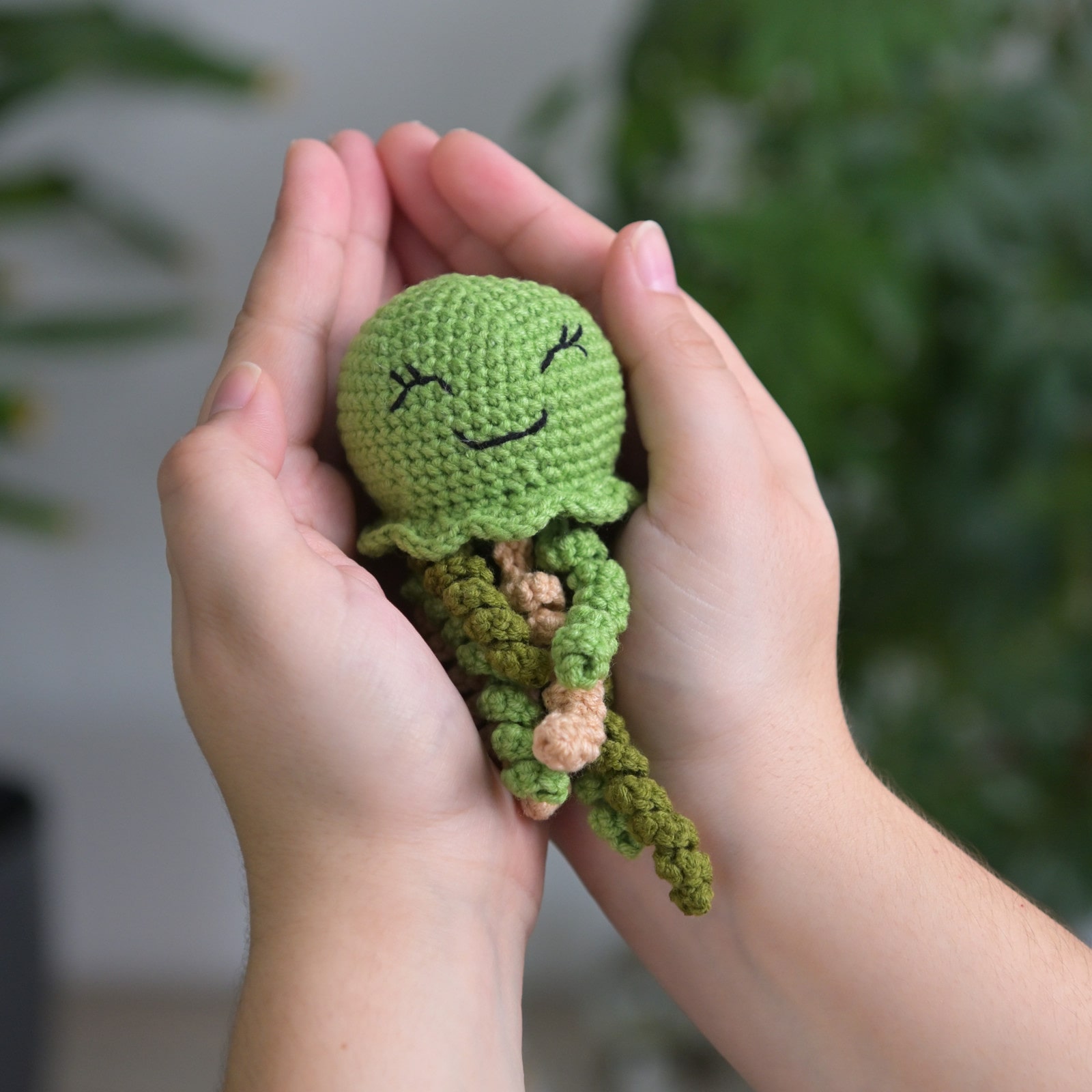Její mírumilovný a vyšívaný úsměv s přivřenýma očima šíří klid a pohodu. Skvěle padne do dlaně a je ideální na mačkání a hlazení. Každá chobotnička je jedinečný ručně háčkovaný kousek. To zaručuje detailní zpracování a lásku vloženou do každého stehu. Hledáte-li malý, ale srdci milý dárek, tato Chobotnička je perfektní volbou. Je ideální pro milovníky mořských motivů, ruční práce a pro každého, kdo potřebuje trochu slunce a barvy.