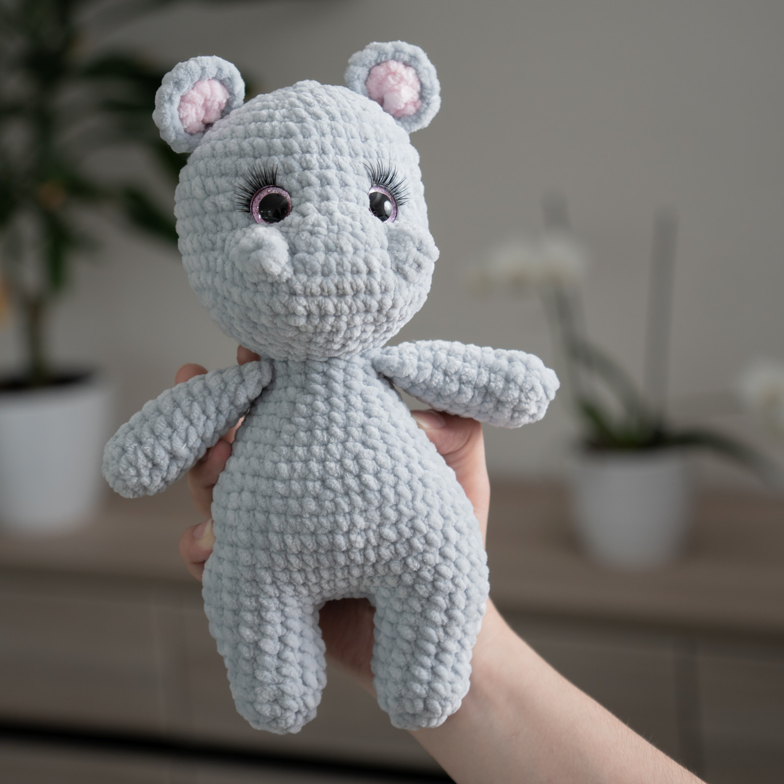 Tento ručně háčkovaný Hroch je mistrovské dílo hebkosti a stylu. Vyrobený z luxusní plyšové (žinylkové) příze, je neodolatelně jemný na dotek. Růžové detaily uší a dlouhé řasy mu dodávají roztomilý a elegantní vzhled.
