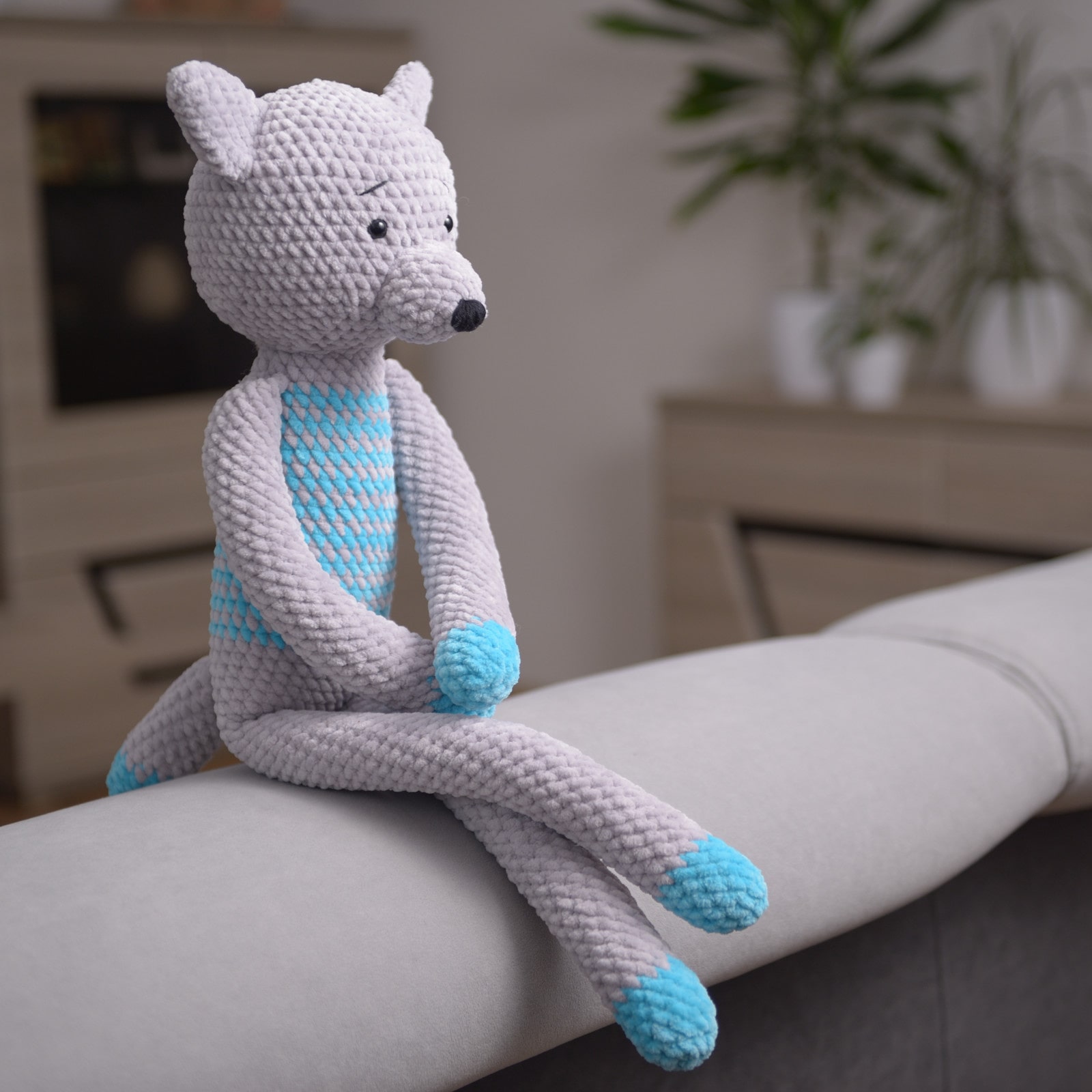 Jedinečný, ručně háčkovaný Vlk v nadstandardní velikosti, vyrobený z extra měkké plyšové příze. Má moudrý výraz, šedé tělíčko a na sobě stylový pruhovaný svetr. Detaily tlapek dodávají hravost. Perfektní pro velké objetí a jako dominantní, originální dekorace do každého interiéru.
