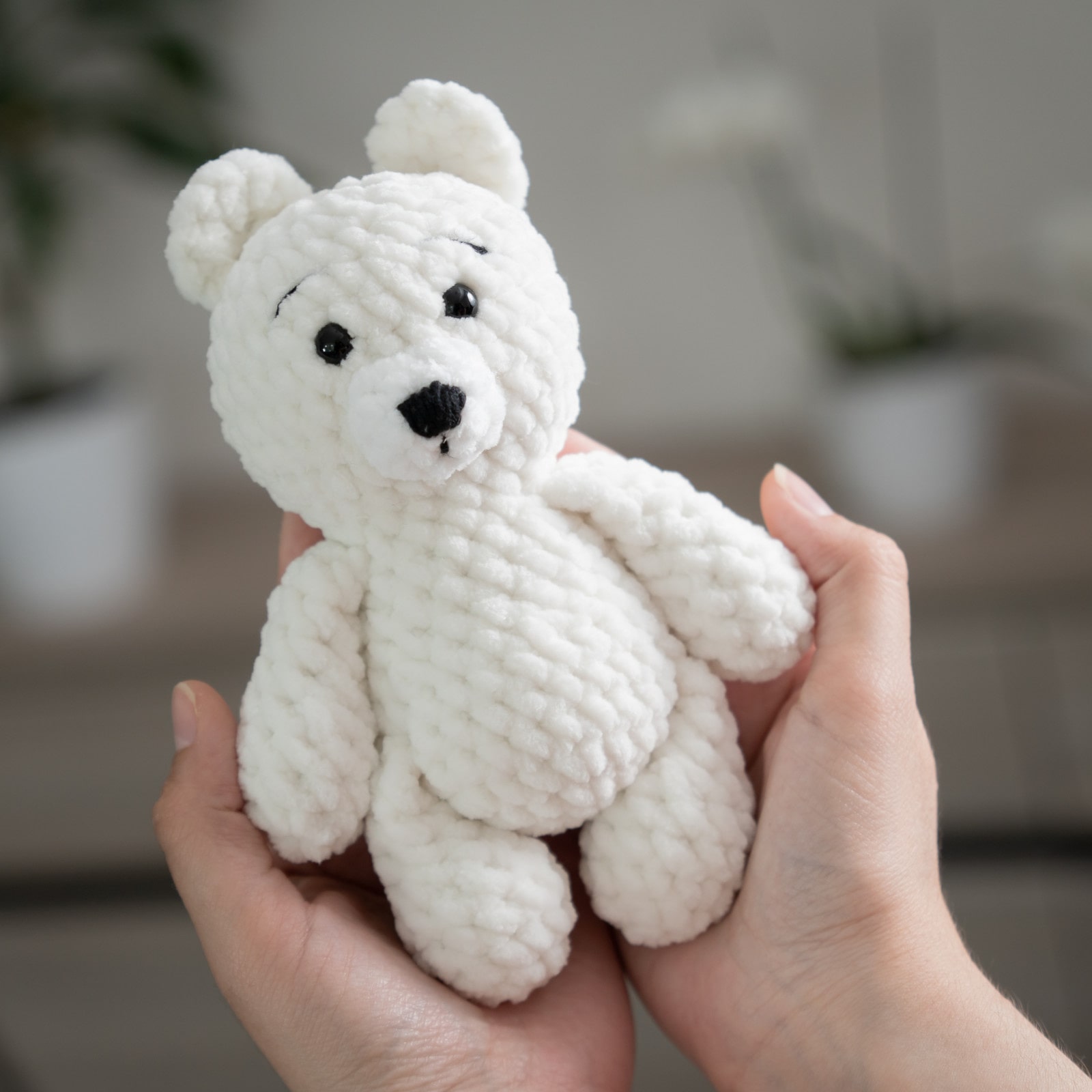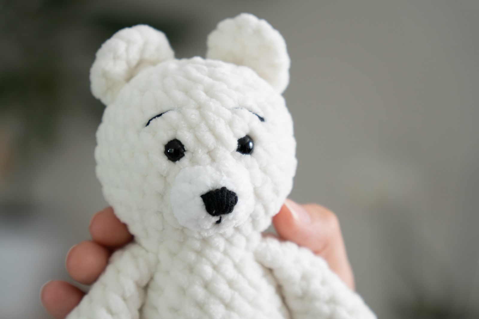 Klasický a nesmírně plyšový, ručně háčkovaný medvídek v čistě bílé barvě. Je vyroben z jemné žinylkové příze, která je tak hebká, že ji nebudete chtít pustit. Nadčasový design s černým čumáčkem a očima. Dokonalý jako stylový doplněk do minimalistického interiéru.